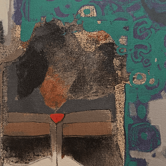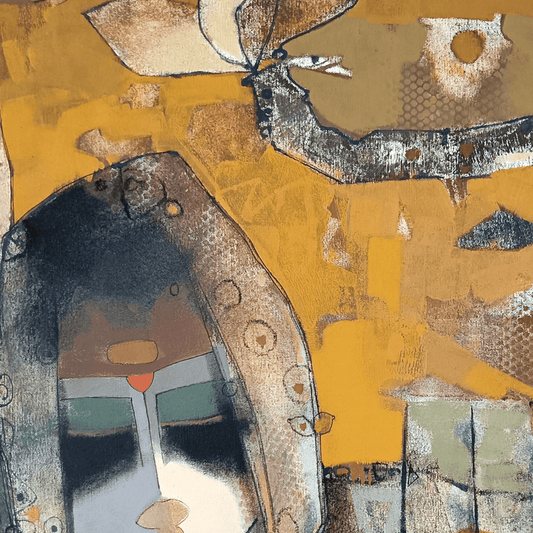 Sachin Jaltare, hailing from a small town in Maharashtra, took a risk when he decided to quit his illustrator job at an advertising agency to take up painting full-time. Starting with figurative painting, Jaltare soon moved on to more abstract work. His art may be seen as a manifestation of the wild tango of Shiva and Shakti, dancing as it does between form and formlessness, energy and desire, the mortal and the divine. His mixed media works combine figurative and abstract elements seamlessly, hinting at metamorphosis even as they seem minimalistically complete in themselves.... They feature mirages and fragments of women with cascading hair and rugged, chiselled men, set against abstract, moody landscapes coloured in a shadowy and nocturnal palette of voluminous black, stark white, bright coral, pewter and sunshine yellow. Traditional motifs and symbols such as petals or the bindu are found scattered across his canvases, and accentuate the spiritual, mystic charm of his works.