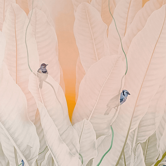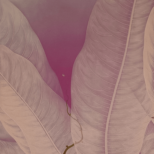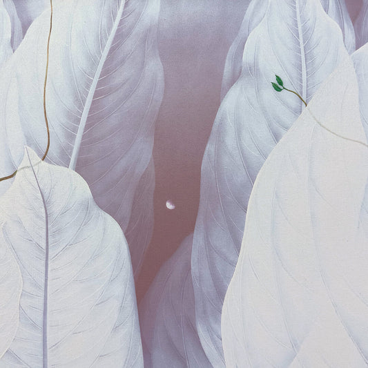 Human figures rarely inhabit Manish Chavda’s world, and the animals and birds found in his landscapes are always few in number. He strives in his work to evoke a meditative experience, expressing the inner life of things through his slow and savoured process. ... The simplicity of his style, and of his subjects, make his representations seem natural and organic, yet Chavda creates unique associations and relationships between them. What stories do they tell: the moon and the white champa, the cow and the single leaf, the squirrel and the small bird? With languorous strokes and layers, he builds an atmosphere bordering on the spiritual, but his works remain devoid of devotional reference and function. Chavda usually chooses a base colour and then explores it at every level of transparency, from nearly black to practically white, through the spectrum. Probing every possible variation through oil, he builds texture through colour as much as his deft, delicate brushstrokes.