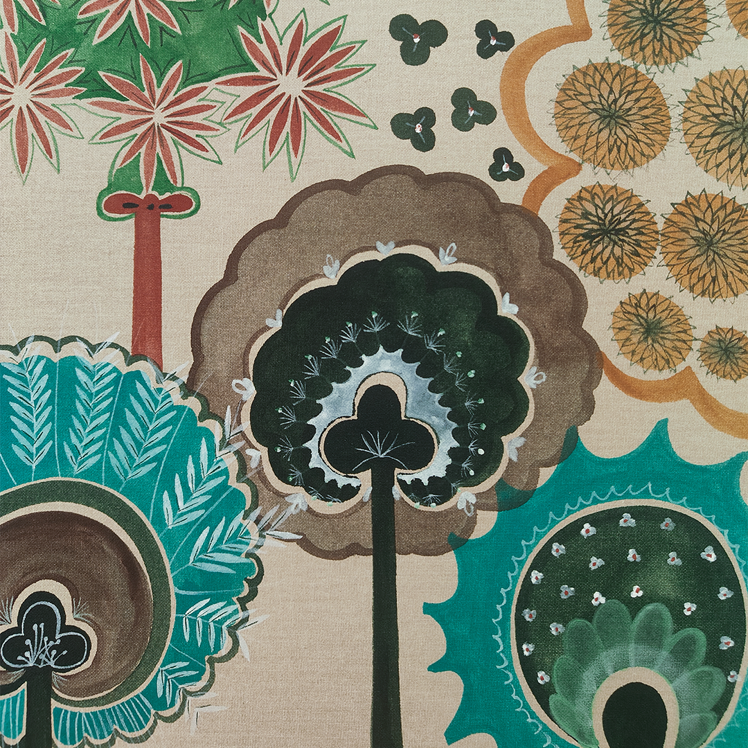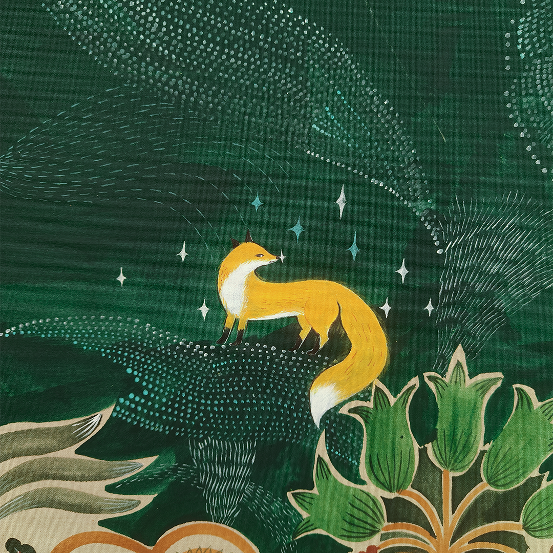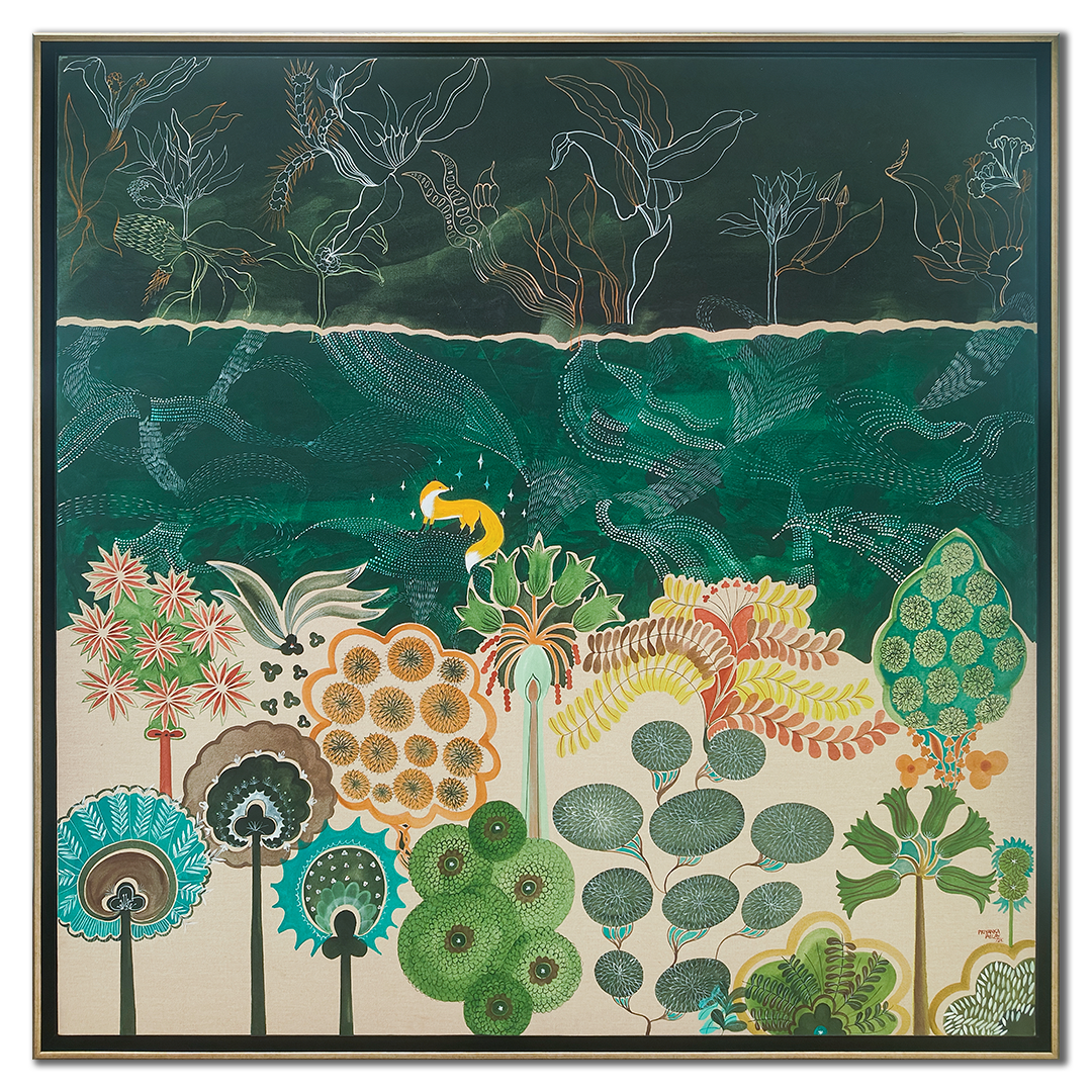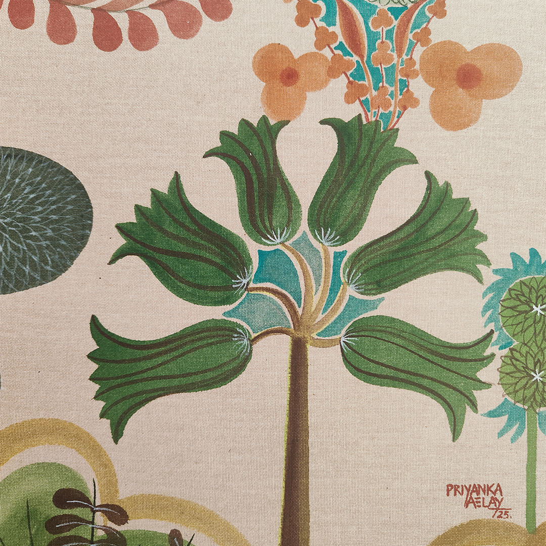 Priyanka Aelay’s acrylic works unfold like magic realist tales filled with birds, beasts, animals, trees and flowers in bold, vibrant colours. Her mythical, enchanted forests are filled with intricate motifs, exquisite patterns and striking imagery. ... On her canvas, age-old folk heritage — particularly from Telangana, from where she hails — is transformed into something that is distinctly contemporary and wholly unique, as she seeks inspiration from the environment and indigenous flora and fauna. Aelay’s paintings reflect the energy, momentum and simplicity of folk art, as well as the aesthetics and language of contemporary art. Paintings do not follow a linear perspective in the artist’s work, as she plays with space, dimensions and perspective to make the landscapes appear free flowing and free floating. Aelay’s works are an invitation to transport and immerse yourself in the unboundedness of nature and the wilderness, something sorely lacking in our urban ecosystems.