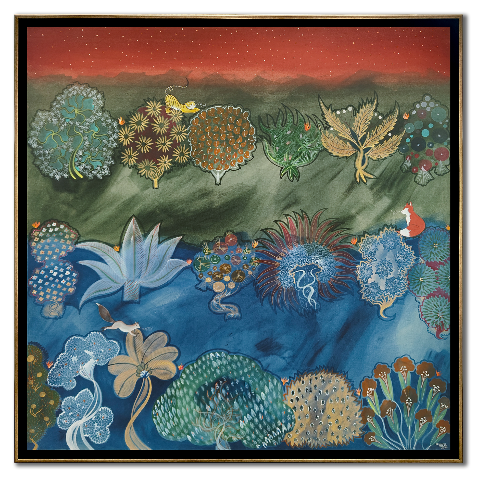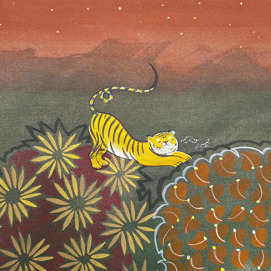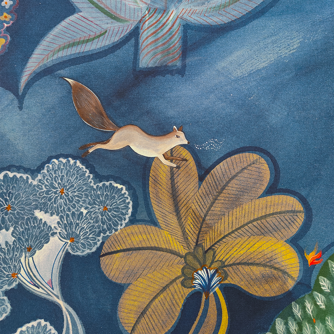 Priyanka Aelay’s acrylic works unfold like magic realist tales filled with birds, beasts, animals, trees and flowers in bold, vibrant colours. Her mythical, enchanted forests are filled with intricate motifs, exquisite patterns and striking imagery. ... On her canvas, age-old folk heritage — particularly from Telangana, from where she hails — is transformed into something that is distinctly contemporary and wholly unique, as she seeks inspiration from the environment and indigenous flora and fauna. Aelay’s paintings reflect the energy, momentum and simplicity of folk art, as well as the aesthetics and language of contemporary art. Paintings do not follow a linear perspective in the artist’s work, as she plays with space, dimensions and perspective to make the landscapes appear free flowing and free floating. Aelay’s works are an invitation to transport and immerse yourself in the unboundedness of nature and the wilderness, something sorely lacking in our urban ecosystems.