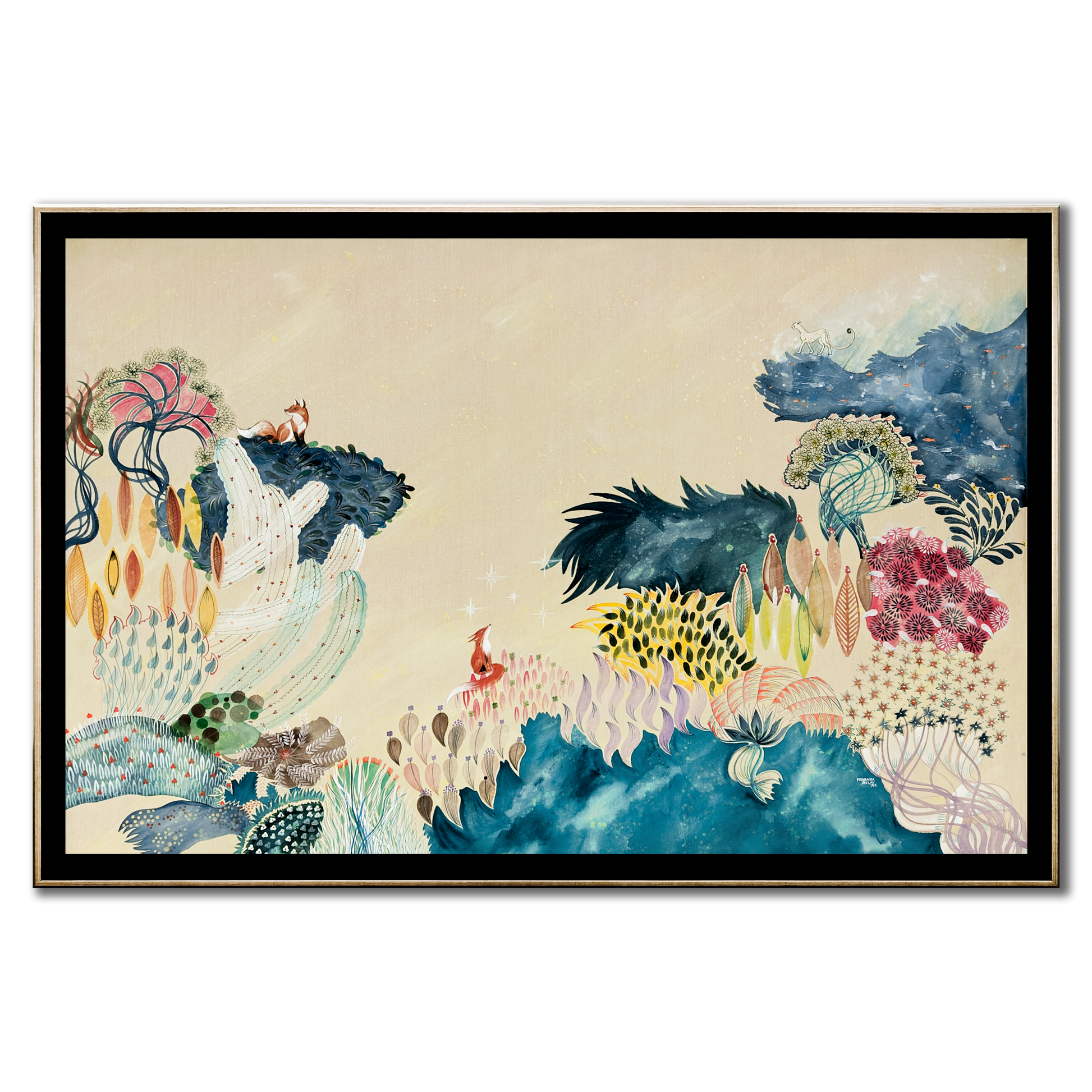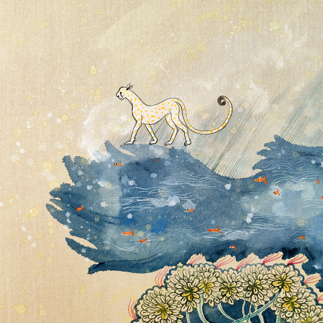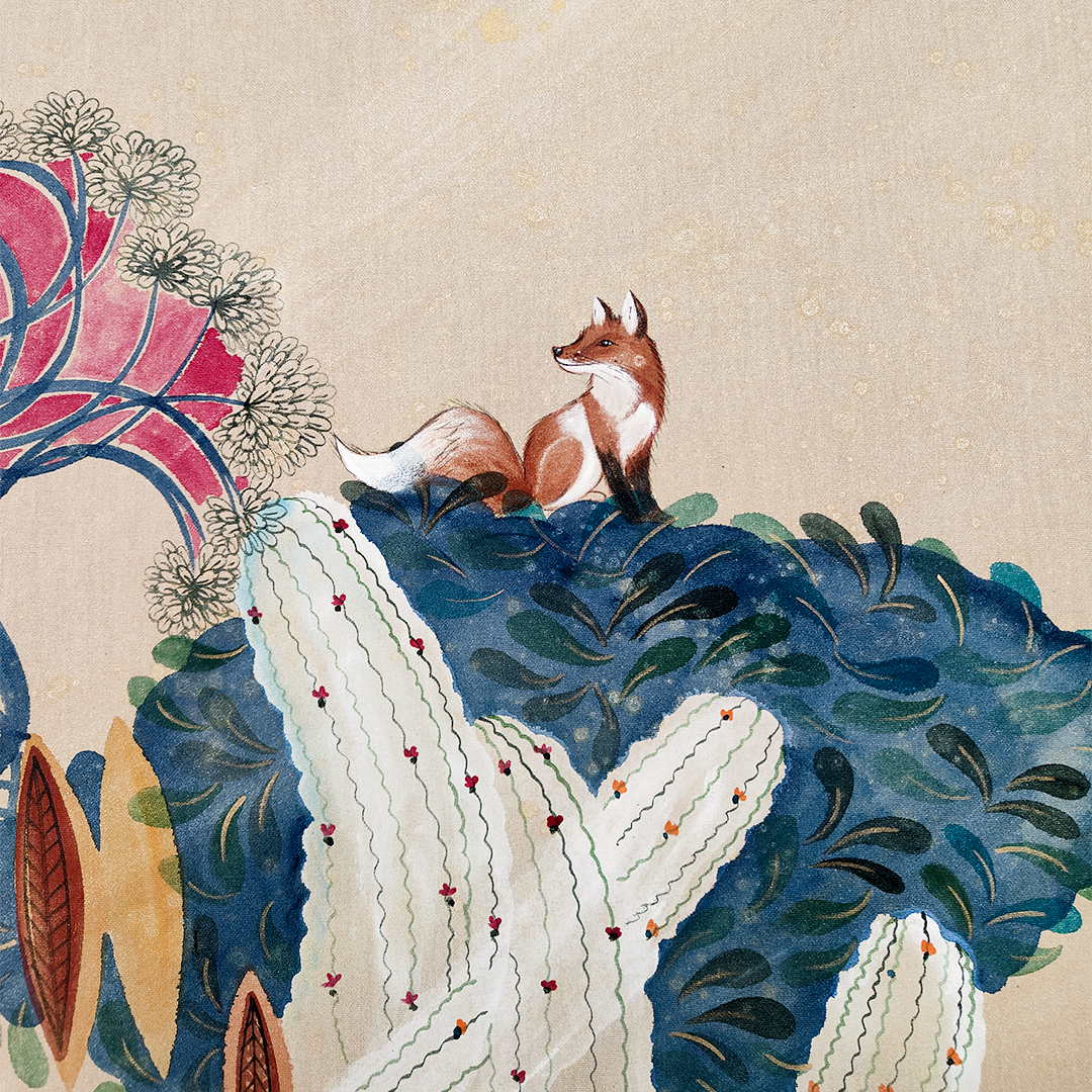 Priyanka Aelay’s acrylic works unfold like magic realist tales filled with birds, beasts, animals, trees and flowers in bold, vibrant colours. Her mythical, enchanted forests are filled with intricate motifs, exquisite patterns and striking imagery. ... On her canvas, age-old folk heritage — particularly from Telangana, from where she hails — is transformed into something that is distinctly contemporary and wholly unique, as she seeks inspiration from the environment and indigenous flora and fauna. Aelay’s paintings reflect the energy, momentum and simplicity of folk art, as well as the aesthetics and language of contemporary art. Paintings do not follow a linear perspective in the artist’s work, as she plays with space, dimensions and perspective to make the landscapes appear free flowing and free floating. Aelay’s works are an invitation to transport and immerse yourself in the unboundedness of nature and the wilderness, something sorely lacking in our urban ecosystems.